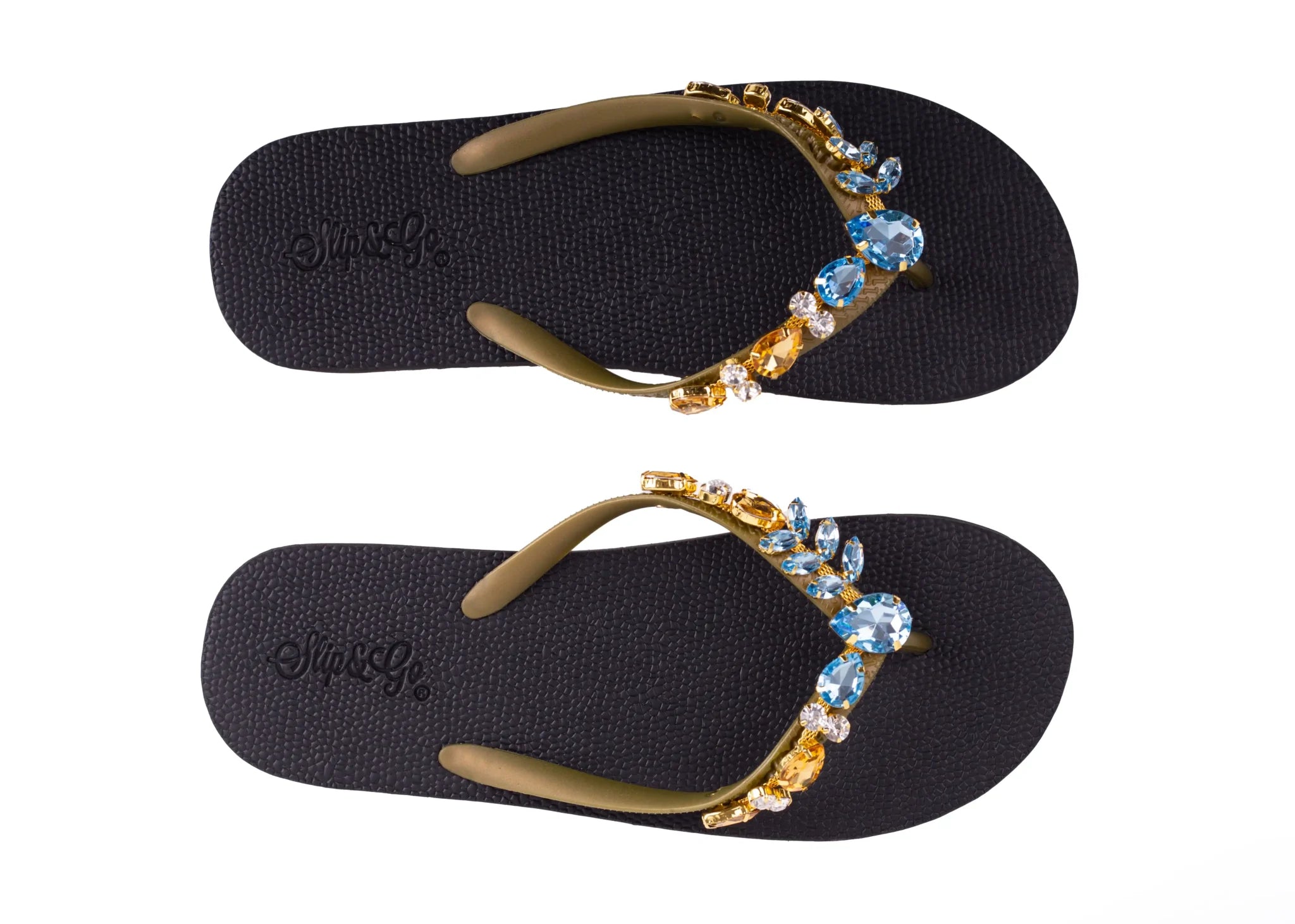 Flip-flop size chart with yellow sandal and blue strap on a white background