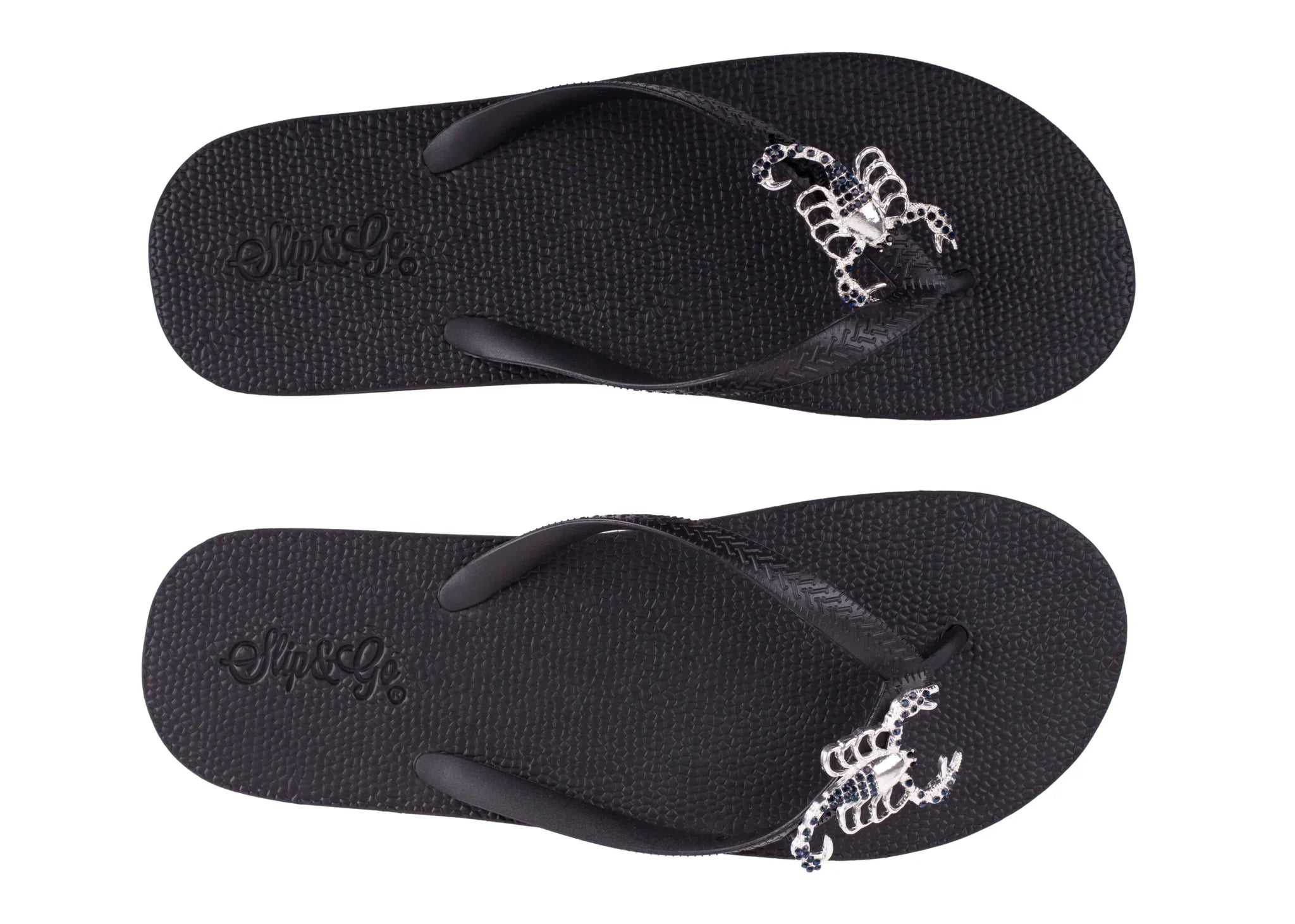 Flip-flop size chart with yellow sandal and blue strap on a white background