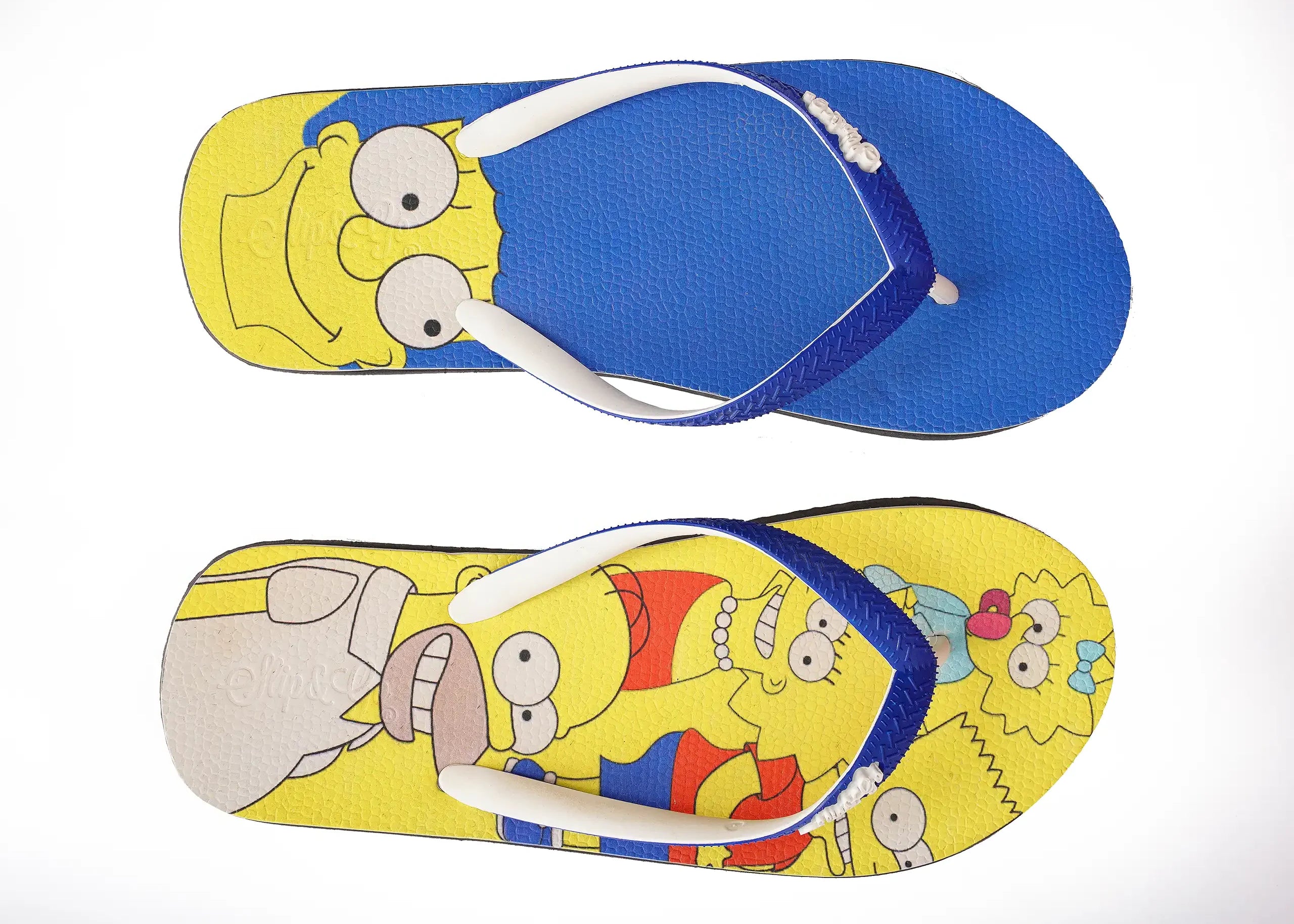 Flip-flop size chart with yellow sandal and blue strap on a white background